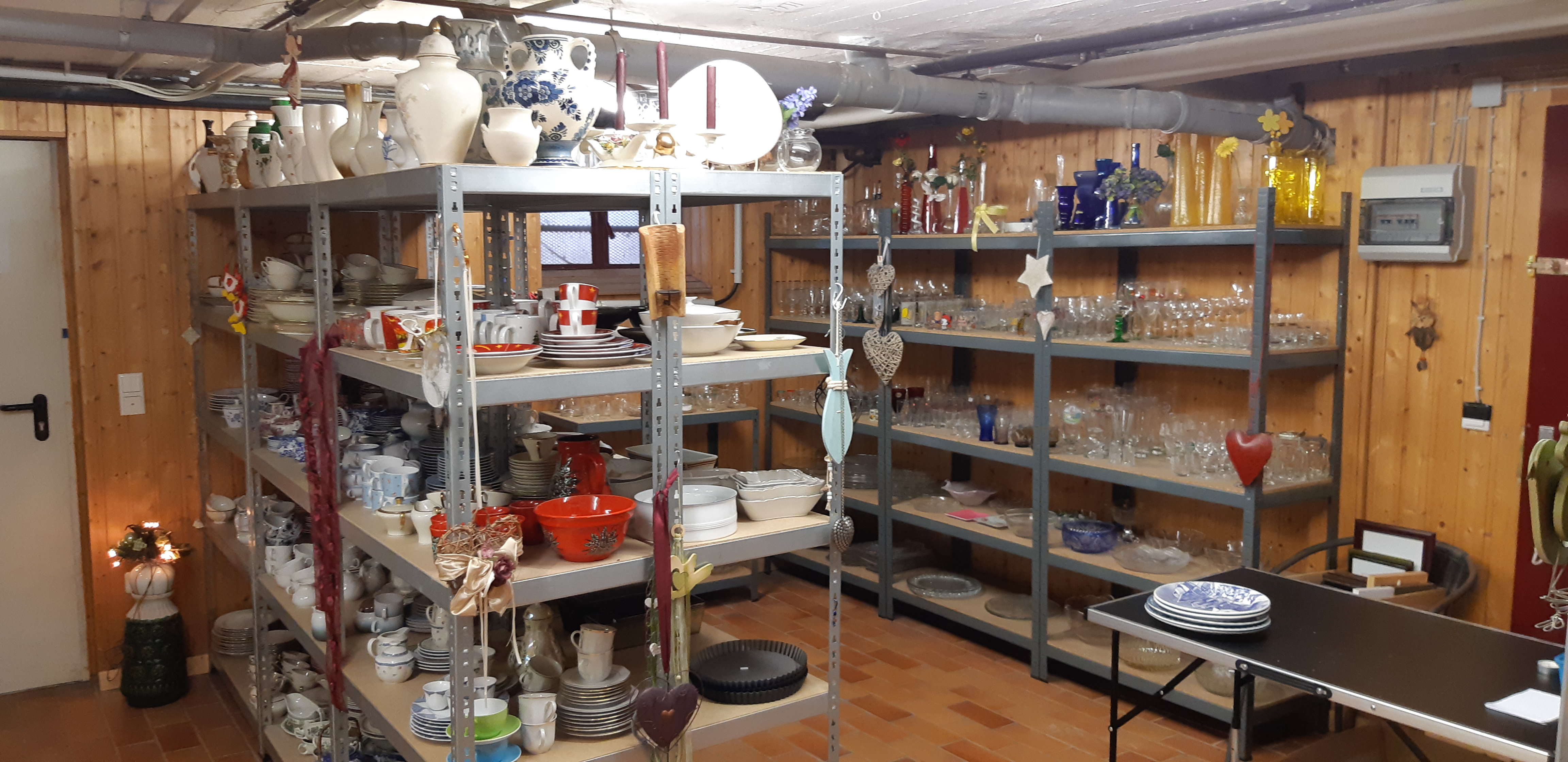 Zwischen Regalen mit Gläsern, Tellern und Töpfen steht Gaby Leuschner. Auch sie arbeitet ehrenamtlich. In der Haushaltswarenabteilung geht es um Grundausstattung. „Töpfe sind der Renner“, sagt sie.